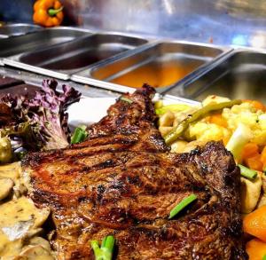 استخوان تی، یک طرف راسته و یک طرف فیله، سس قارچ، پوره سیب زمینی، سبزیجات تفت داده شده با روغن سیر
