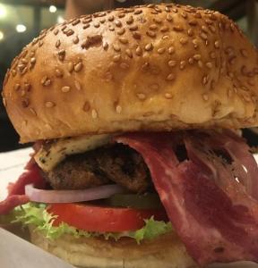 ۱۵۰ گرم گوشت بیفتک گریل شده، پیازکاراملایزشده، پنیرمخصوص، سس مخصوص، کاهو فرانسوی، پیاز، گوجه