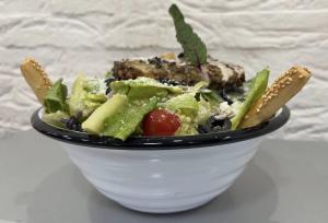 کاهو رسمی - سینه مرغ مزه دار شده - سس مخصوص - گوجه گیلاسی - زیتون سیاه - دانه آفتابگردان - نان کروتان - پنیر پارمزان