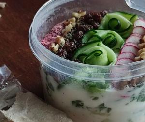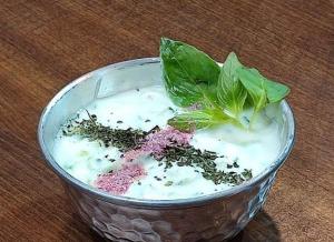 دوغ محلی, ماست چکیده, نان خشک, خیار, گردو, کشمش, نعناع خشک, گل محمدی, سبزیجات معطر.