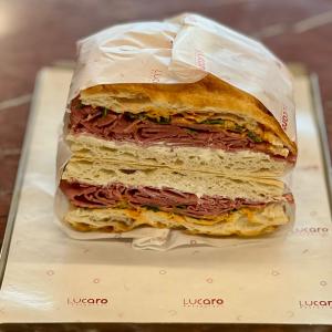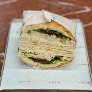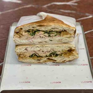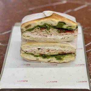 نان فوکاچا ،سینه بوقلمون فراوری ،کرم پستو، پنیر لبنه، روکولا، گوجه خشک،روغن زیتون فرابکر