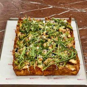خمیر حجیم و سبک دیترویت ، سینه ی مرغ طعم دار ، سس چیمیچوری ، تاپینگ روکولا و موزارلا