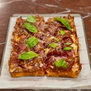 خمیر حجیم و سبک دیترویت ، پپرونی ، سس رد بوفالو ، هالوپینو ، تاپینگ ریحان ایتالیایی ، ادویه تند، موزارلا