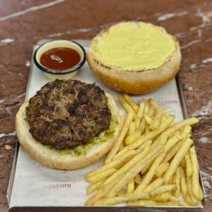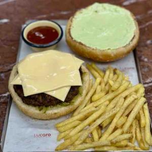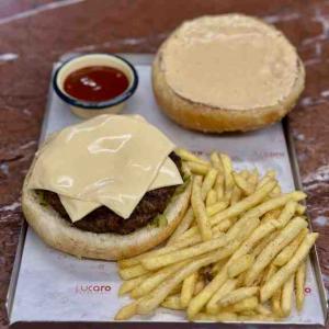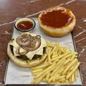برگر دست ساز ، پنیر دودی ، سس باربیکیو ، رلیش خیار ، پیاز کاراملی ، نان مک ، فرنچ فرایز