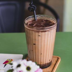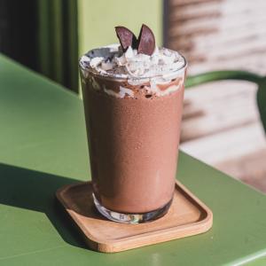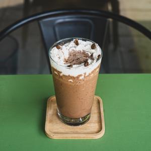 یک شات قهوه ۲۰% روبوستا، ۸۰% عربیکا، شیر، فوم شیر، شکلات ذوب شده، همراه با یک عدد شکلات، یک عدد کوکی