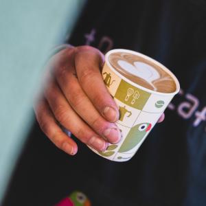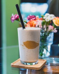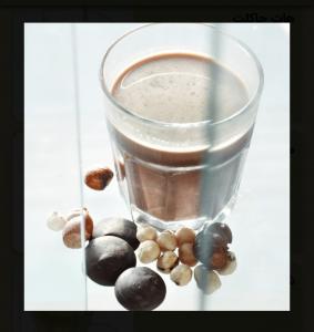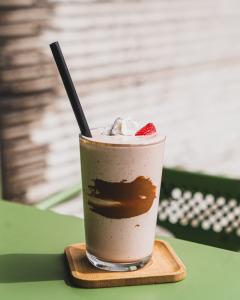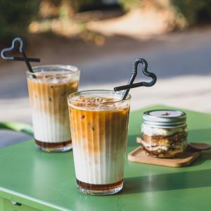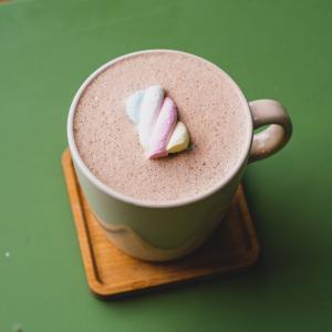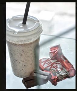 ترکیب مساوی یک شات قهوه ۱۰۰% عربیکا و شیر گرم، همراه با یک عدد شکلات، یک عدد کوکی