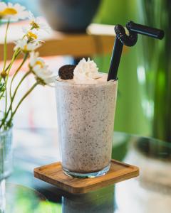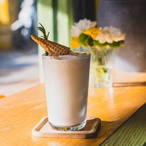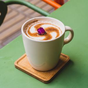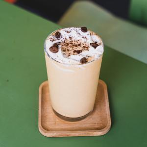 فوم شیر، یک شات قهوه ۲۰% روبوستا، ۸۰% عربیکا، همراه با یک عدد شکلات، یک عدد کوکی