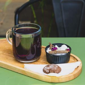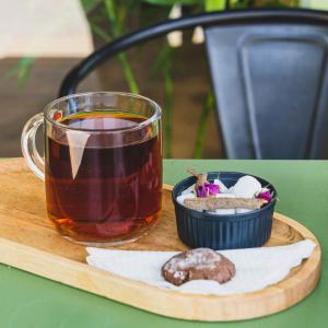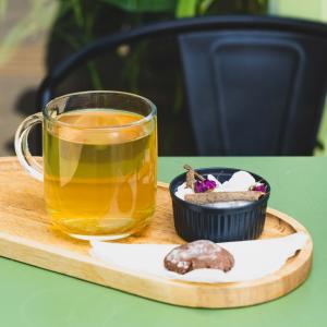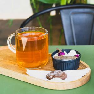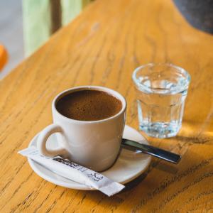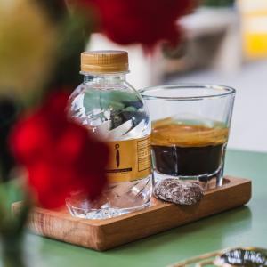 یک شات قهوه ۲۰% روبوستا، ۸۰% عربیکا، همراه با یک عدد شکلات، یک عدد کوکی