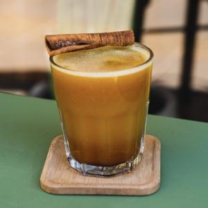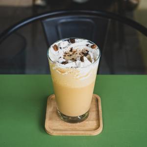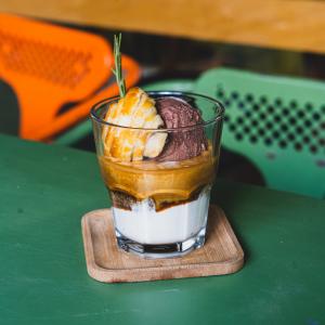 یک شات قهوه ۲۰% روبوستا، ۸۰% عربیکا، یک لکه فوم شیر، سیروپ کارامل، وانیل، همراه با یک عدد شکلات، یک عدد کوکی