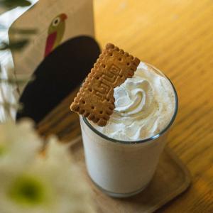 فوم شیر، یک شات قهوه ۱۰۰% عربیکا، همراه با یک عدد شکلات، یک عدد کوکی