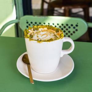 یک شات قهوه ۱۰۰% عربیکا، شیر، فوم شیر، شکلات ذوب شده، همراه با یک عدد شکلات، یک عدد کوکی