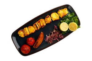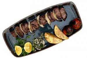 شیشلیک شاندیز،برنج ایرانی،گوجه،فلفل تند،پیاز و جعفری،سیب زمینی تنوری