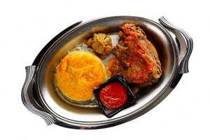 ۳۰۰ گرم جوجه زعفرانی،برنج ایرانی،گوجه،فلفل تند،پیاز و جعفری،سیب زمینی تنوری