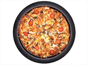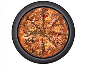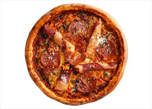 خمیر خانگی،سس مارینارا،بیکن میکس،پپرونی،کیپرز،فلفل دلمه ی کبابی،چدار، موتزارلا