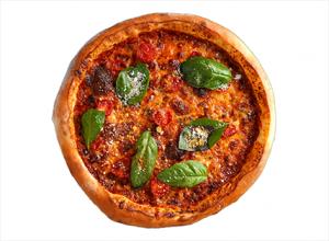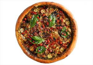 خمیر خانگی،سس مارینارا،کدو،قارچ،بادمجان،زیتون،دلمه رنگی،گوجه،موتزارلا،ریحان