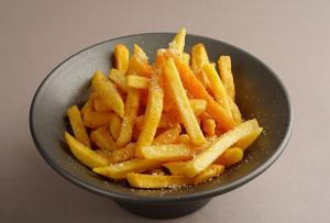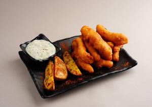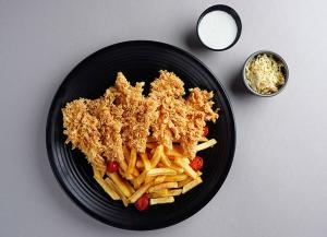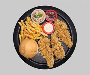 فیله مرغ سوخاری،سیب زمینی سرخ شده،سالاد کلم،سس سیر،سس کچاپ