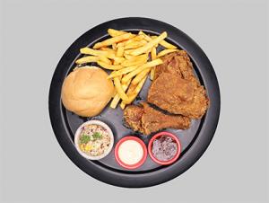ران مرغ-سیب زمینی سرخ شده-سالاد کلم-سس سیر-سس کچاپ-نان بروچن