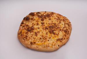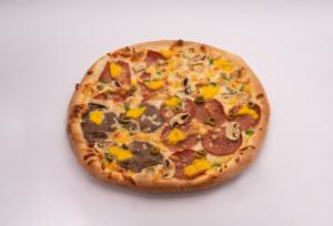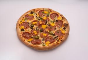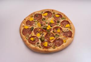 خمیر مخصوص - سس مارینارا - پپرونی - پنیر گودا - فلفل دلمه - زیتون- سالسیچا (گوشت چرخ کرده مزه دار شده)