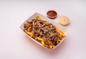خمیر مخصوص - سس مارینارا - گوشت رست بیف ریش ریش شده - قارچ - پنیر گودا - زیتون