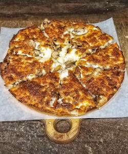 سینه مرغ، قارچ، فلفل دلمه، گوجه فرنگی، پیاز، پنیر، سس مخصوص