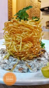 فیله گوساله، قارچ، خامه، سیب زمینی خرد شده
