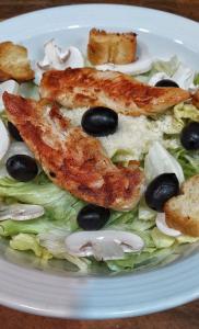 کاهو، قارچ، پنیر بارمزان، فیله مرغ، نان تست، زیتون سیاه