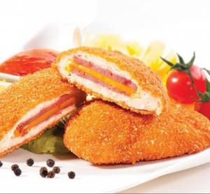 هر عدد کوردن بلو شامل سینه مرغ چرخ شده ،یک ورق ژامبون ،یک ورق پنیر گودا