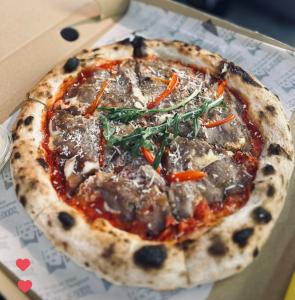 سس مارینارا ، موزارلای مخصوص ، 120گرم فیله گوساله طعم دار و اسلایس شده ، قارچ بلانچ شده ، فلفل رنگی و سس سیر ، تمام شده با روکولای تازه ، پنیر پارمسان و روغن طعم دار