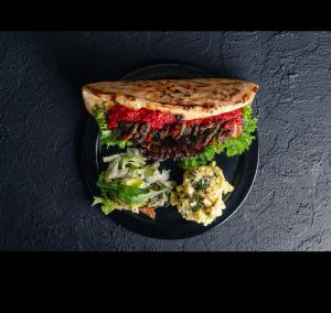 ۱۲۰ گرم گوشت راسته ، کاهو فرانسوی ، گوجه و خیارشور اسلایس شده ، سس رمولاد و دیپ گودا ، پیاز اسلایس شده گارنیش سالاد سبزیجات و سیب زمینی تنوری