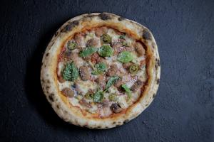 سس گوجه ایتالیایی ، موزارلای مخصوص ، 100گرم پپرونی تند 85٪ ، تمام شده با هالوپینو، روکولای تازه ، پنیر پارمسان و روغن طعم دار