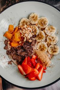 جو دوسر شیرین شده با عسل و پودر کاکائو به همراه موز - توت فرنگی - چیاسید - پودر نارگیل و تخمه آفتاب گردان