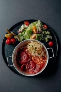 سس گوجه، استیک ورقه، پیاز، قارچ، روغن سیر