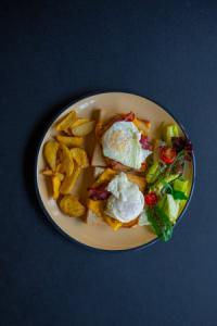 تخم مرغ - اسفناج و قارچ ساته - پنیر گودا - سیب زمینی وج - سالاد