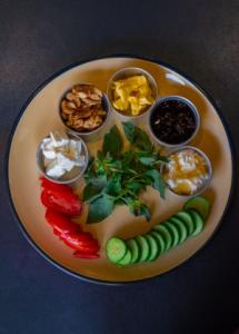 میکس کاهو + کلم قرمز + هویج + جوانه ماش + گوجه چری + نان سیر + نان کنجدی + پنیر فتا + نودل کریسپی + مرغ گریل