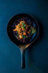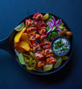 میگو گریل به همراه سبزیجات وسیب زمینی سرخ کرده خانگی و سالاد