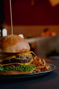 سس گوجه تند، گوشت چرخ کرده، فلفلدلمه، پیاز، زیتون، پنیر گودا، سیب زمینی کریسپی