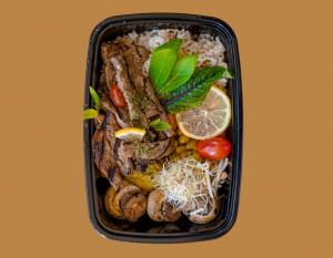 کالری 493.7 - گوشت رست بیف/گوجه/قارچ/فلفل دلمه ای/ایولی/ریحان/پیاز/نان پروتئین/لبنه کم چرب