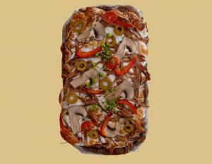 کالری 740.1 - خمیر جو/گوشت رست شده/سس گوجه/قارچ/فلفل دلمه ای/پنیر بدون چربی/زیتون/پیاز