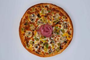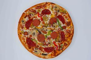 خمیر پیتزا+سس مارینارا+ژامبون+پنیر پیتزا+پپرونی+زیتون+فلفل دلمه ای+قارچ بلانچ+هات داگ