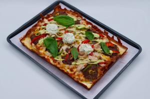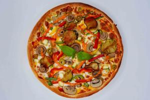 خمیر پیتزا+سس مارینارا+فلفل دلمه ای+قارچ بلانچ+کدو بلانچ+زیتون+سس پاپریکا+ریحان+چیپس بادمجان