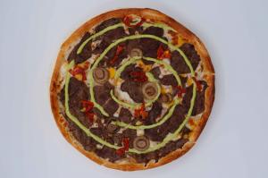 خمیر پیتزا+سس بیانکا+پولد بیف+پنیر پیتزا+زیتون+قارچ بلانچ+پیازچه+پیکل پیاز