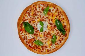 خمیر پیتزا+سس مارینارا+پنیر پیتزا+پنیر پارمزان+ریحان