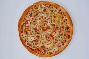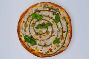 خمیر پیتزا+سس بیانکا+سس پستو+سینه مرغ مزه دار+پنیر پیتزا+قارچ بلانچ+زیتون+ریحان
