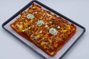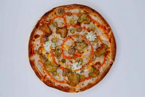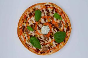 خمیر پیتزا+سس مارینارا+سینه مرغ مزه دار+قارچ بلانچ+زیتون+پنیر پیتزا+چیپس بادمجان+کرم چیز