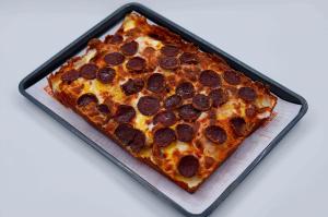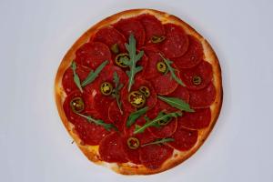 خمیر پیتزا+سس رومسکو+پپرونی+پنیر پیتزا+هالوپینو+روکولا