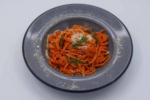 لینگوئینی+میگو+سس پاپریکا+پارمزان+روکولا