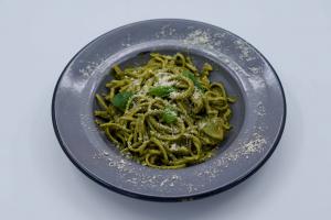 لینگوئینی+مرغ+سس پستو و خامه+ریحان ایتالیایی+پارمزان