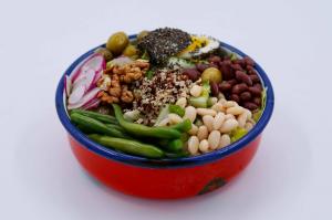 میکس کاهو+تخم مرغ آب پز غلطیده در دانه چیا+لوبیا قرمز و سفید+لوبیا سبز+کینوا+گردو+درسینگ لمون اولیو