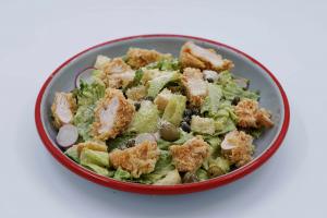 مرغ سوخاری+کاهو+سس سزار+نان تست+تربچه+کیپر+زیتون+پنیر پارمزان