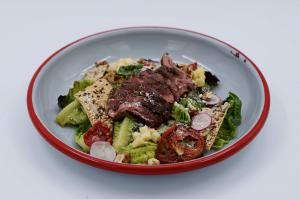 فیله گوساله+میکس کاهو+سس گشنیز+نان رژیمی+سالسا سیب+گردو+گوجه خشک فرآوری شده